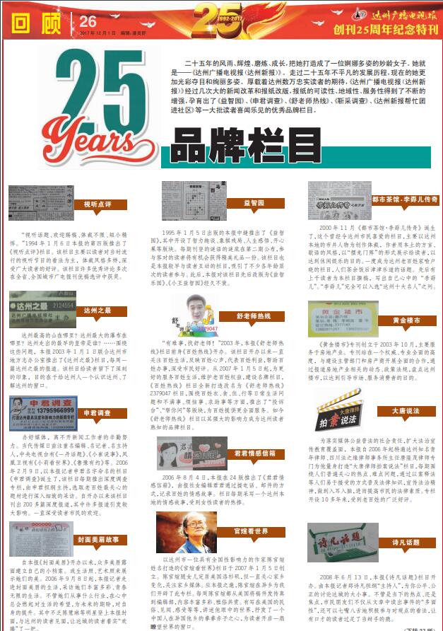 二十五年的風(fēng)雨、輝煌、磨煉、成長,把她打造成了一位婀娜多姿的妙齡女子。她就是——《達(dá)州廣播電視報(bào)(達(dá)州新報(bào))》。走過二十五年不平凡的發(fā)展歷程,現(xiàn)在的她更加光彩奪目和絢麗多姿。厚載著達(dá)州數(shù)萬忠實(shí)讀者的期待,《達(dá)州廣播電視報(bào)(達(dá)州新報(bào))》經(jīng)過幾次大的新聞改革和報(bào)紙改版,報(bào)紙的可讀性、地域性、服務(wù)性得到了不斷的增強(qiáng),孕育出了《詩凡話題》等一大批讀者喜聞樂見的優(yōu)秀品牌欄目。