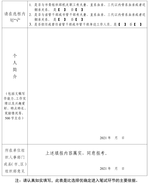 采取組織推薦和個人自薦相結合方式報名。報考人員請于3月26日(星期五)12:00前將報名表(含電子版)、干部任免審批表、干部黨風廉政及檔案審核意見,經(jīng)所在單位黨組織或其組織部門審核同意后報市委組織部機關黨委(市政綜合樓1604辦公室)。